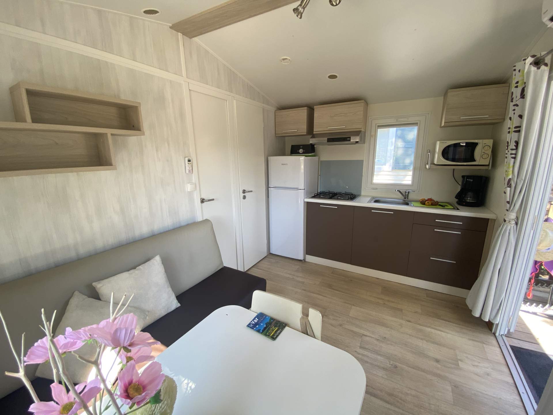 Kitchen with gas hob, fridge-freezer, hood, microwave and coffee machine
